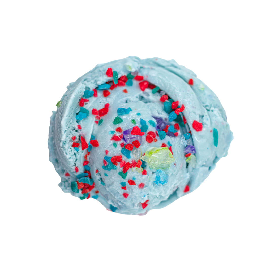 inspired by O Brother, Where Art Thou? blue rasberry base studded with jewel colored rock candy topped with Pop Rocks